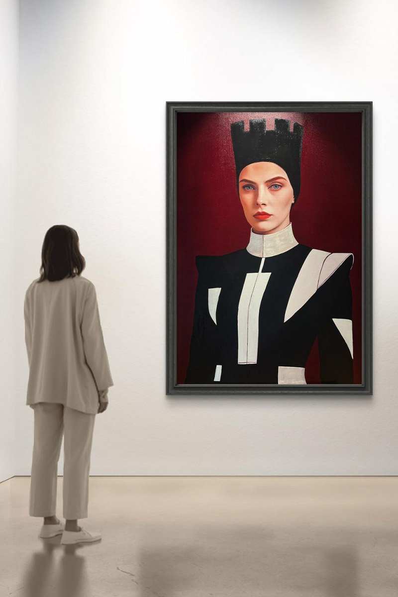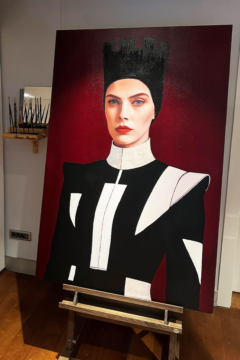 In this work, Simay Kışlaoğlu explores the idea of calm as a form of strength. The figure carries two gazes: one lowered inward, and one meeting the viewer with quiet confidence. The bold geometric forms and crown-like silhouette create a sense of armour, suggesting a woman who protects her inner world while standing firmly in her outer one. “Apatheia” brings together vulnerability and control, showing how both can exist within a single face.